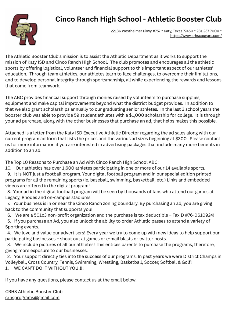Would you like to become a Cinco Ranch Athletic Booster Club Sponsor?